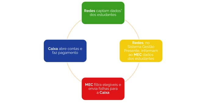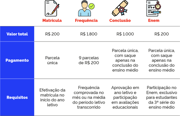 O programa oferece diversos tipos de incentivos, desde a matrícula até a conclusão do ensino médio. Cada etapa cumprida com sucesso resulta em um incentivo financeiro para o estudante, depositado em uma conta bancária aberta automaticamente em seu nome. Os principais incentivos são: